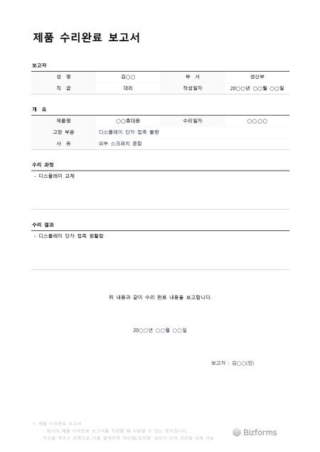 제품수리완료보고서입니다. 제품수리를 완료한 보고서를 작성할 때 사용할 수 있는 문서입니다.