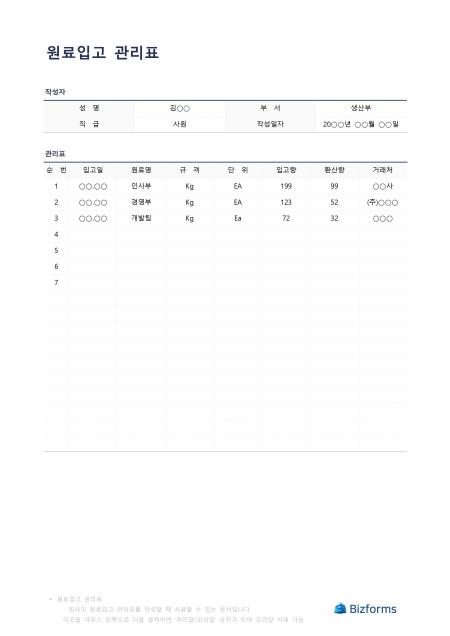 원료입고관리표입니다. 원료 입고 내역 관리표를 작성할 때 사용할 수 있는 문서입니다.