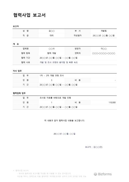 협력사업보고서입니다. 협력 사업 내용을 보고서를 작성할 때 사용할 수 있는 문서입니다.