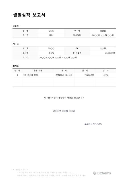 월말실적보고서입니다. 월말의 실적 보고서를 작성할 때 사용할 수 있는 문서입니다.