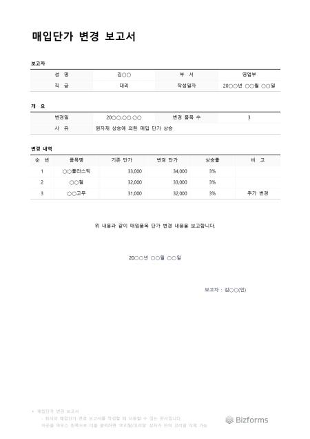 매입단가변경보고서입니다. 매입 단가가 변경된 보고서를 작성할 때 사용할 수 있는 문서입니다.