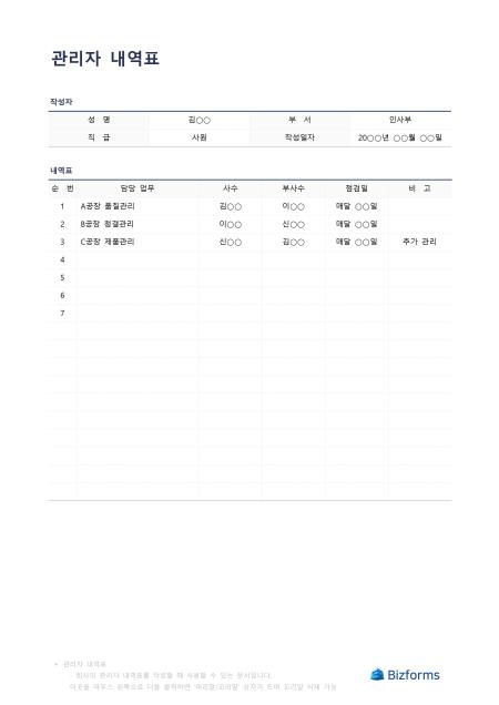 관리자내역표입니다. 관리자들의 내역표를 작성할 때 사용할 수 있는 문서입니다.
