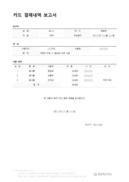 카드결제내역보고서입니다. 카드 결제한 내역 보고서를 작성할 때 사용할 수 있는 문서입니다.