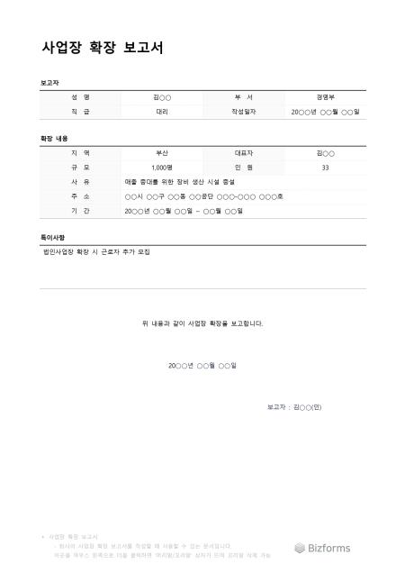사업장확장보고서입니다. 사업장 확장에 대한 보고서를 작성할 때 사용할 수 있는 문서입니다.