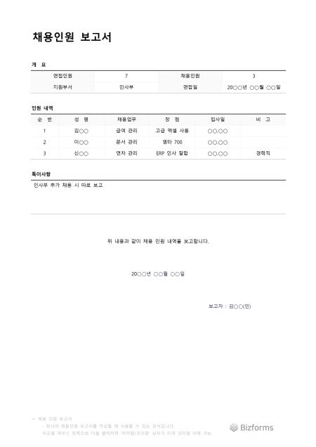 채용인원보고서입니다. 채용한 인원에 대한 보고서를 작성할 때 사용할 수 있는 문서입니다.