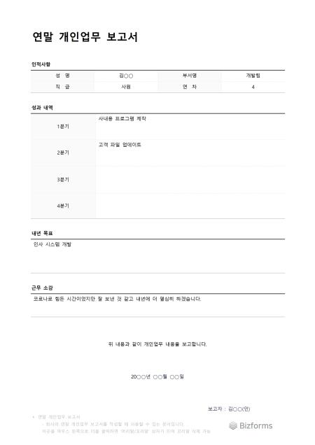 연말개인업무보고서입니다. 연말 개인업무에 대한 보고서를 작성할 때 사용할 수 있는 문서입니다.