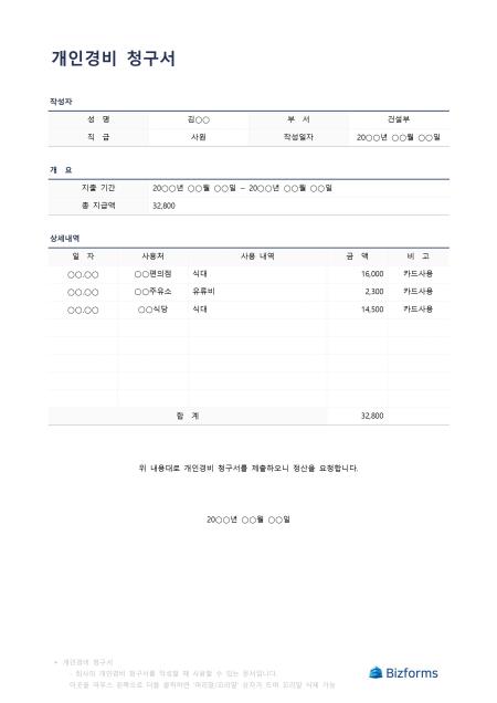 개인경비 청구서 서식입니다. 개인경비 청구서 서식은 직원이 업무상 발생한 지출 중 개인이 먼저 비용을 부담했을 때, 이를 회사에 청구하여 상환받기 위해 사용하는 공식 문서로, 이 서식을 활용하면 지출 일자, 항목, 금액, 사용 목적 등 세부 내역을 명확하게 기록하여 투명하고 효율적인 경비 정산을 가능하게 합니다. 따라서 정확한 비용 처리를 통해 회사와 직원 모두의 업무 부담을 줄여주는 중요한 역할을 하는 서식입니다.
