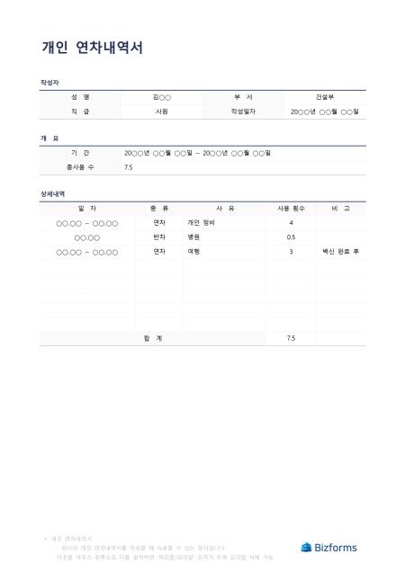 개인연차내역서입니다. 개인연차 내역서를 작성할 때 사용할 수 있는 문서입니다.
