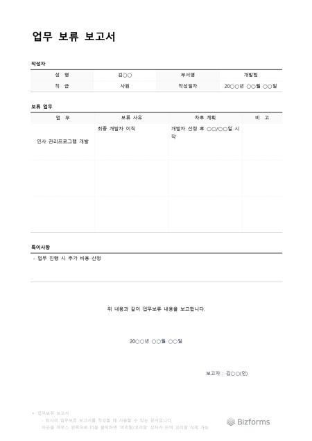 업무보류보고서입니다. 업무 보류에 대한 보고서를 작성할 때 사용할 수 있는 문서입니다.