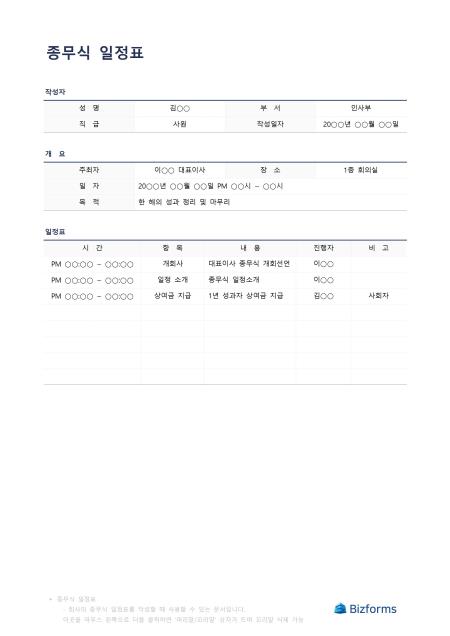 종무식일정표입니다. 종무식 일정표를 작성할 때 사용할 수 있는 문서입니다.