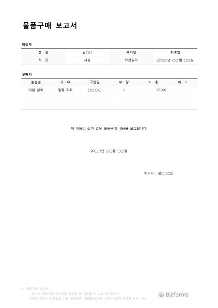 물품구매보고서입니다. 물품 구매에 대한 보고서를 작성할 때 사용할 수 있는 문서입니다.