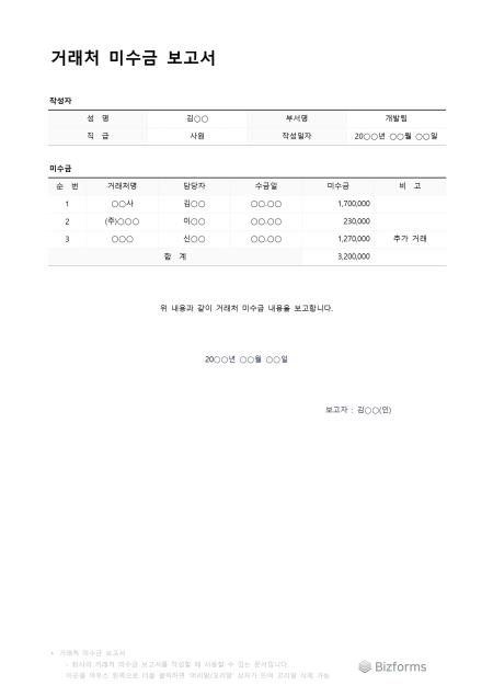 거래처미수금보고서입니다. 거래처 미수금에 대한 보고서를 작성할 때 사용할 수 있는 문서입니다.