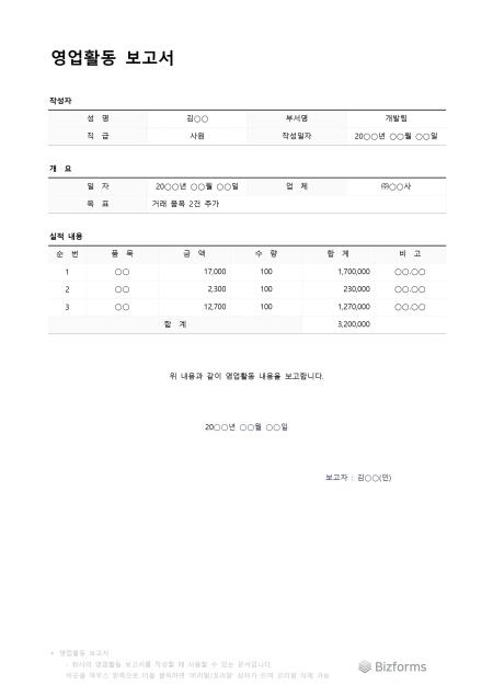 영업활동보고서입니다. 영업 후 활동 보고서를 작성할 때 사용할 수 있는 문서입니다.