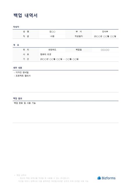 백업내역서입니다. 백업 내역서를 작성할 때 사용할 수 있는 문서입니다.