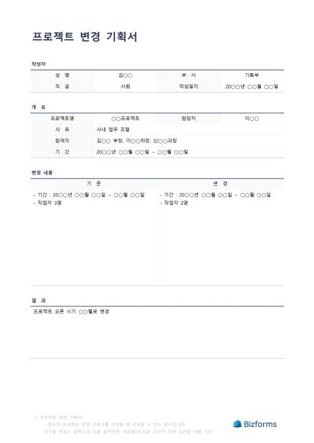 프로젝트변경기획서입니다. 프로젝트 변경 기획서를 작성할 때 사용할 수 있는 문서입니다.