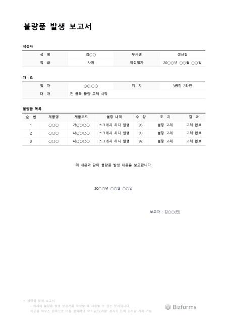 불량품발생보고서입니다. 불량품 발생 보고서를 작성할 때 사용할 수 있는 문서입니다.