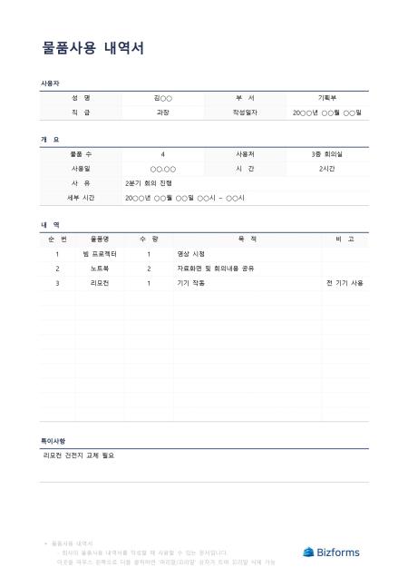 물품사용내역서입니다. 물품을 사용한 내역서를 작성할 때 사용할 수 있는 문서입니다.