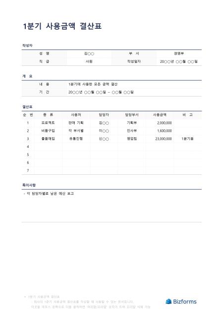 1분기사용금액결산표입니다. 1분기에 사용했던 금액 결산표를 작성할 때 사용할 수 있는 문서입니다.
