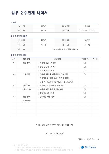 업무 인수인계 내역서입니다. 회사의 업무 인수인계 내역서를 작성할 때 사용할 수 있는 문서입니다.