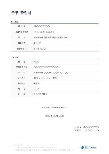 근무 확인서입니다. 회사의 근무 확인서를 작성할 때 사용할 수 있는 문서입니다.