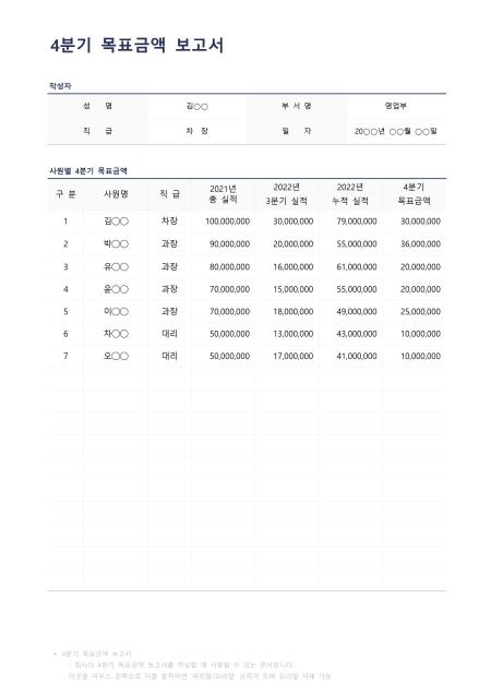 4분기 목표금액 보고서입니다. 4분기 목표금액 보고서를 작성할 때 사용할 수 있는 문서입니다.