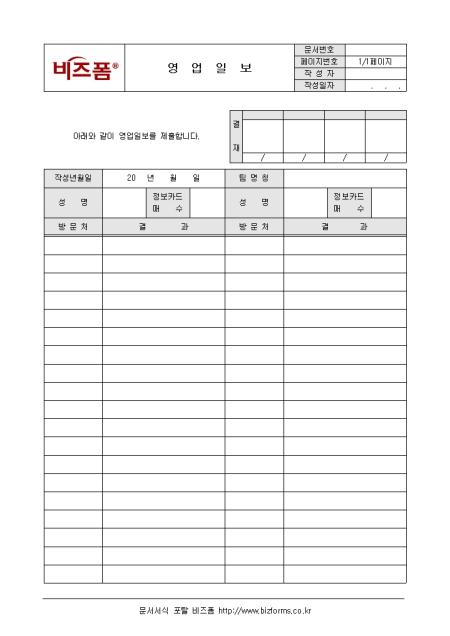 하루간의 영업활동사항을 기록하는 영업일보입니다. 성명, 정보카드매수, 방문처, 결과 등의 항목으로 구성되어있으며 매일 작성 기록합니다.