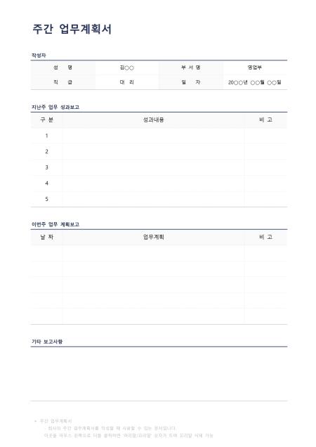 주간 업무계획서입니다. 주간 업무계획서를 작성할 때 사용할 수 있는 문서입니다.