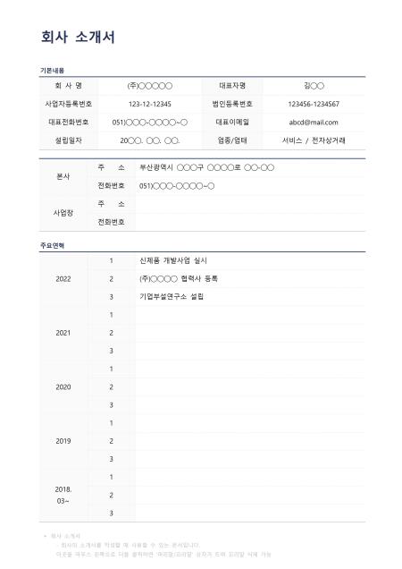 회사 소개서입니다. 회사 소개서를 작성할 때 사용할 수 있는 문서입니다.