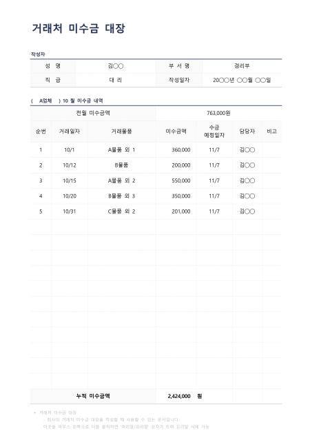 거래처 미수금 대장입니다. 거래처 미수금 대장을 작성할 때 사용할 수 있는 문서입니다.