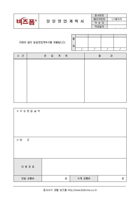 하루동안의 영업 활동 계획을 세울 때 사용하는 일일영업계획서입니다. 시간, 영업계획, 결과의 항목으로 구성되어있으며 주요영업실적을 상세히 기록합니다.