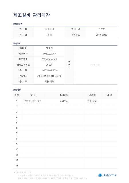 제조설비 관리대장입니다. 제조설비 관리대장을 작성할 때 사용할 수 있는 문서입니다.