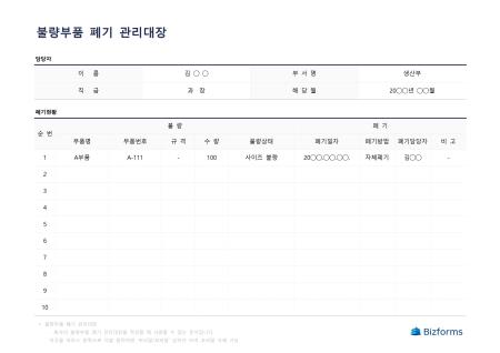 불량부품 폐기 관리대장입니다. 불량부품 폐기 관리대장을 작성할 때 사용할 수 있는 문서입니다.