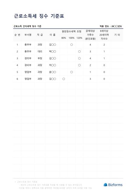 근로소득세 징수 기준표입니다. 근로소득세 징수 기준표를 작성할 때 사용할 수 있는 문서입니다.