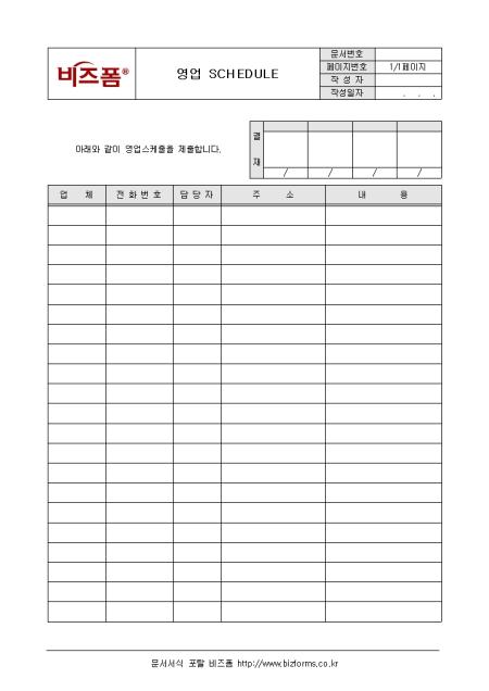 영업스케줄을 기록/관리할 수 있는 영업스케줄표입니다. 업체, 전화번호, 담당자, 주소 등의 항목으로 구성되어있습니다.