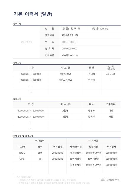 기본 이력서 (일반)입니다. 기본 이력서를 작성할 때 사용할 수 있는 문서입니다.
