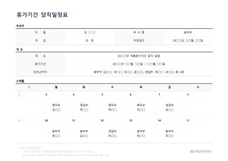 휴가기간 당직일정표입니다. 회사의 휴가기간 당직일정표를 작성할 때 사용할 수 있는 문서입니다.
