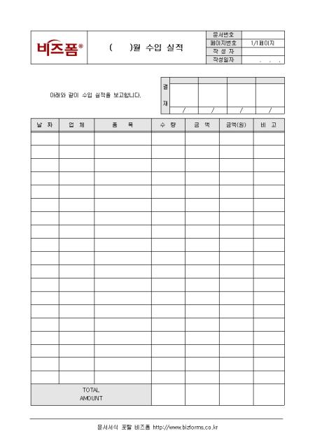 월간 수입 실적을 기록/관리하는 수입실적표입니다. 날짜, 업체, 품목, 수량 등의 항목으로 구성되어있으며 해당부서장에게 보고합니다.
