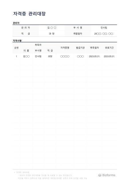 자격증 관리대장입니다. 직원들의 관련 자격증을 관리하고자 할 때 사용할 수 있는 문서입니다.