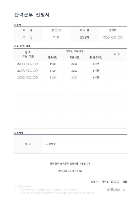 탄력근무 신청서입니다. 탄력근무 신청서를 작성할 때 사용할 수 있는 문서입니다.