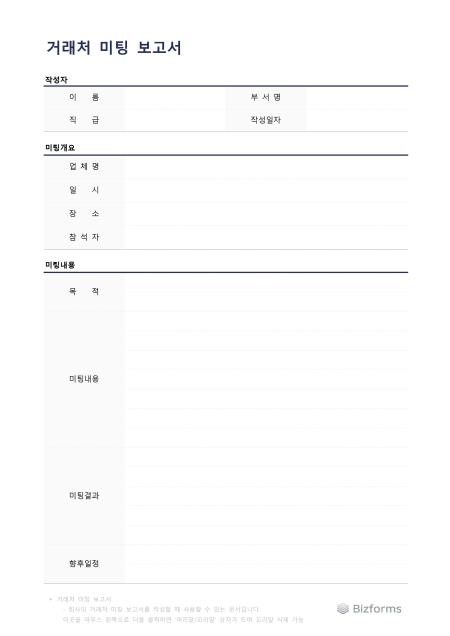 거래처 미팅 보고서입니다. 거래처 미팅 보고서를 작성할 때 사용할 수 있는 문서입니다.