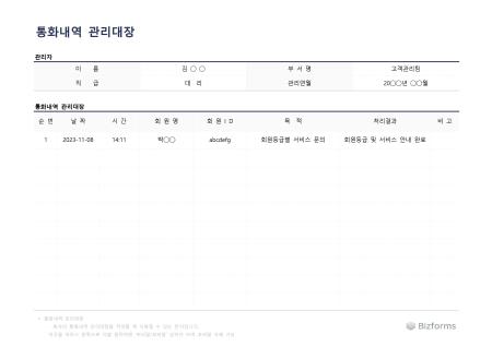 통화내역 관리대장입니다. 통화내역 관리대장을 작성할 때 사용할 수 있는 문서입니다.