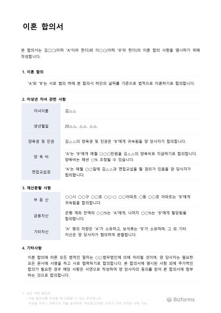 당사자 간의 이혼이 합의된 경우 사용하는 공식 법적 문서로, 이혼 후 중요한 사항들을 명확하게 규정합니다