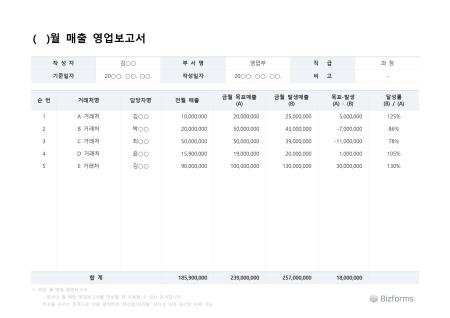 표준 월 매출 영업보고서 서식입니다. 월 매출 영업보고서는 월 매출 및 영업 활동을 체계적으로 정리하여 보고하는 문서로 경영진에게 회사의 성과를 명확히 전달하고, 향후 전략 수립에 중요한 자료로 활용됩니다.