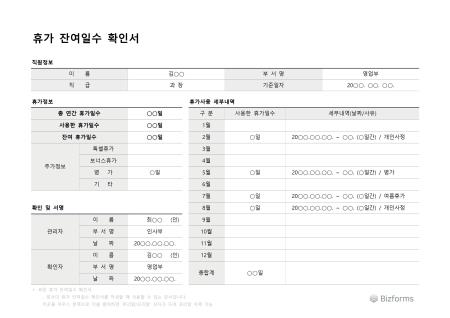 휴가 잔여일수 확인서 서식입니다.(결재란 포함) 휴가 잔여일수 확인서는 직원이 사용한 휴가 일수와 남은 휴가 일수를 체계적으로 관리하고 확인하기 위한 서식으로 직원들이 자신의 휴가 잔여일을 쉽게 확인할 수 있도록 돕습니다.
