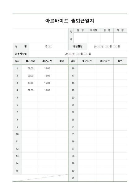 아르바이트 출퇴근일지 (개인별) 서식입니다. 아르바이트 출퇴근일지는 아르바이트 근로자가 출근 및 퇴근 시간을 기록하는 문서로 이를 통해 근로 시간, 출결 상태 등을 확인하고 급여 계산을 정확하게 할 수 있습니다.