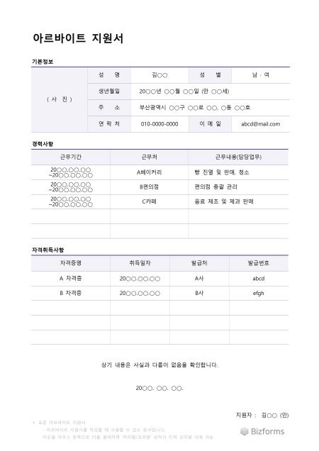 아르바이트 지원서 서식입니다. 아르바이트 지원서 서식은 지원자가 자신의 정보를 기업에 제출하기 위해 사용하는 문서입니다. 아르바이트 지원서 작성시에는 정확한 정보를 제공해야 합니다. 개인 정보, 학력, 경력 등을 정확하게 기재해야 하며, 잘못된 정보 제공은 신뢰를 잃게 할 수 있습니다.