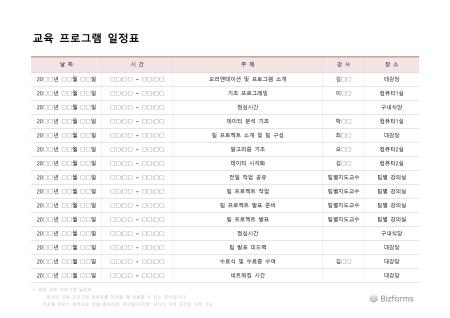 표준 교육 프로그램 일정표 서식입니다. 교육 프로그램 일정표는 교육 과정이나 프로그램의 일정을 체계적으로 관리하고 계획하는 데 사용됩니다. 이 일정표는 교육 활동을 효율적으로 조직하고 참여자들이 계획된 활동을 쉽게 따라갈 수 있도록 도와줍니다.