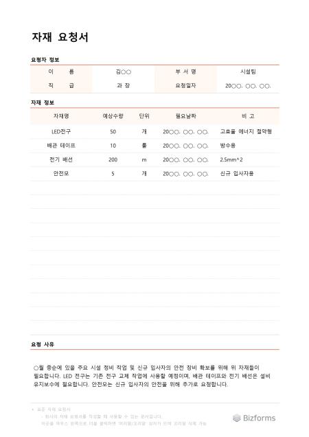 표준 자재요청서 서식입니다. 자재요청서는 기업이나 조직에서 필요한 자재를 요청할 때 사용하는 서식으로 기업이나 조직은 이 서식을 통해 자재 관리와 구매 프로세스를 체계화할 수 있습니다. 요청 내역을 기록하고 승인 과정을 거치면서 자재 수급과 재고 관리에 활용할 수 있습니다.