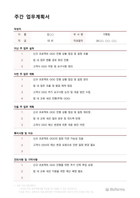 표준 주간 업무계획서 서식입니다. 주요 내용은 작성자의 기본 정보, 지난 주 업무 실적, 다음 주 업무 계획, 그리고 기타 사항 등을 포함합니다. 이를 통해 업무의 연속성과 효율성을 높일 수 있습니다.
