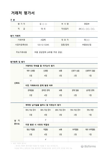 표준 거래처 평가서 서식입니다. 표준 거래처 평가서는 기업이 거래처를 평가하기 위해 사용하는 문서로, 거래처와의 관계를 체계적으로 분석하고 관리하는 데 도움을 줍니다. 이러한 평가서는 거래처의 신뢰성, 재무 상태, 거래 이력 등을 종합적으로 고려하여 점수를 매기고, 이를 바탕으로 거래처와의 지속적인 관계를 결정하는 데 사용됩니다.
